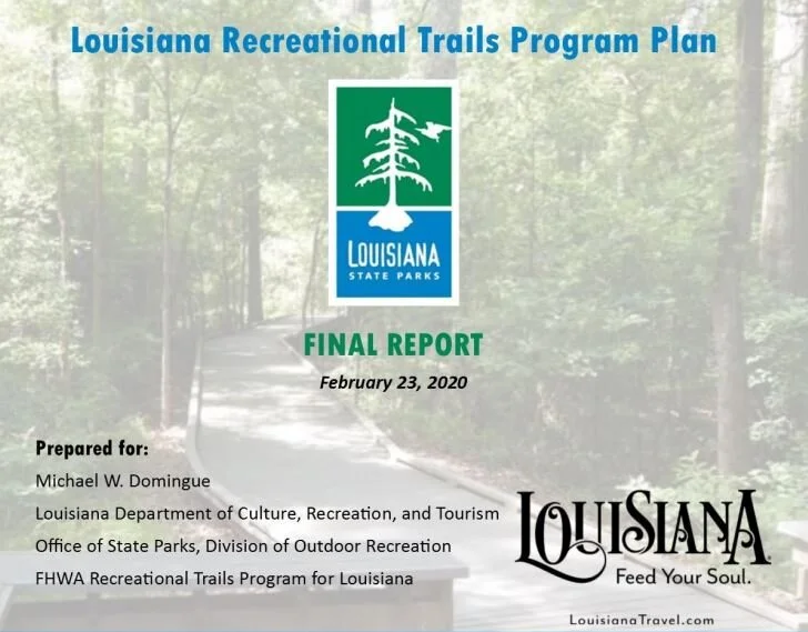 This plan includes goals, measurable objectives, and implementable strategies and actions recommended to guide Louisiana’s RTP into the next decade. These actions are intended to better understand and balance local, regional, and statewide needs and support improved accessibility and connectivity of communities, maximize active transportation and public health impacts, harness economic and environmental benefits, improve data quality and availability, and expand public engagement with and use of Louisiana trails, ensuring continued, equitable expansion of access to high quality recreational and transportation opportunities for trail users of all types, and of all ages and abilities, across the state.